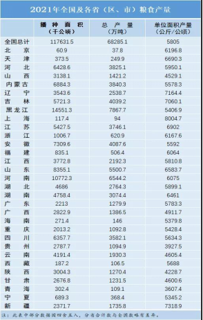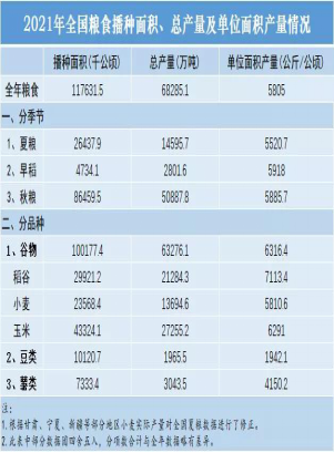 (一)稻谷、小麦、玉米产量均实现增加。2021年,全国谷物产量12655亿斤,比上年增加320亿斤,增长2.6%。其中,稻谷产量4257亿斤,比上年增加20亿斤,增长0.5%;小麦产量2739亿斤,比上年增加54亿斤,增长2.0%;玉米产量5451亿斤,比上年增加238亿斤,增长4.6%。