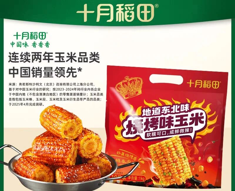 在健康饮食浪潮下,十月稻田打破了传统主食品类限制,把玉米转向轻食化、零食化的方向,切换到了全新的快消品赛道;推出的烧烤味玉米、麻辣味玉米等产品,满足了年轻人对于轻负担与好口感的诉求,收获众多好评。