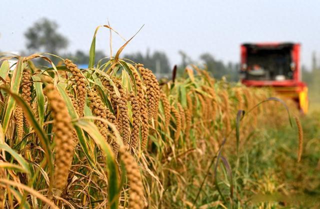 河北省衡水市阜城县建桥乡一谷子种植基地,多台收割机在谷田穿梭,收割、脱粒、秸秆粉碎一气呵成。连日来,当地逾万亩谷子陆续成熟,迎来丰收季。