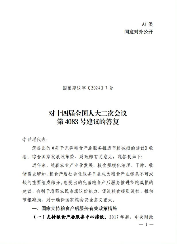 近期,国粮局对关于完善粮食产后服务推进节粮减损的建议进行了答复,答复称:近年来,随着农业产业化发展,粮食规模化清理、干燥、收储需求增加,粮食产后社会化服务日益成为粮食产业链条不可或缺的重要组成部分。完善粮食产后服务推进节粮减损的建议,有利于增强农民市场议价能力、促进粮食提质进档、推动节粮减损,对于确保国家粮食安全意义重大。