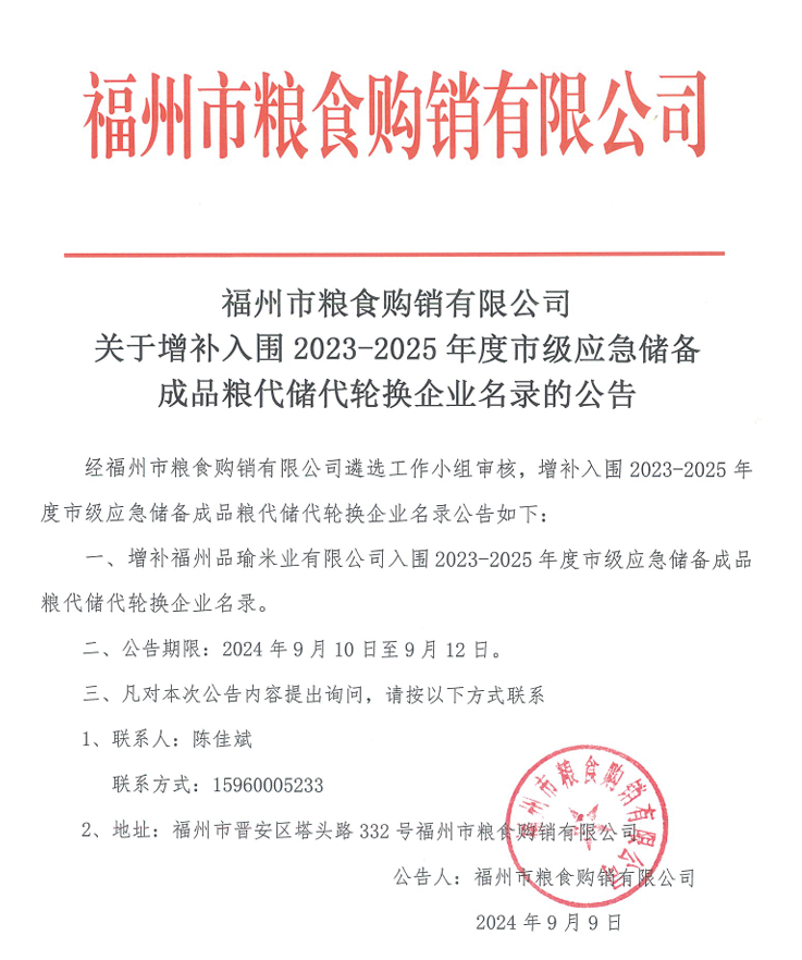 福州市粮食购销有限公司关于增补2023-2025年度市级应急储备成品粮代储代轮换企业名录的公告