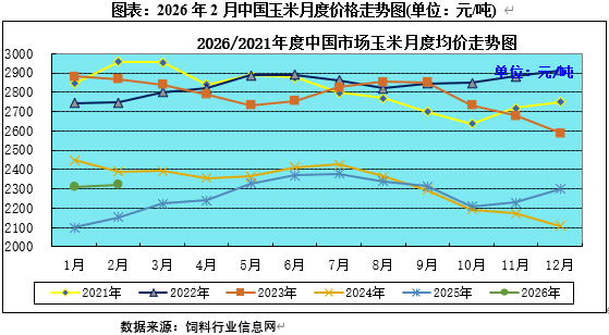 2026年2月国内主产区基层售粮意愿提升,售粮进度继续加快,用粮企业备库意愿整体偏强,贸易囤粮主体也有所增加,现货价格维持偏强走势,全国现货均价月环比涨幅为0.82%。